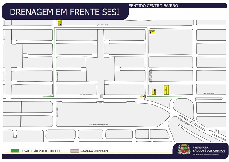 A Avenida Cidade Jardim, na altura do Sesi, terá uma interdição total da pista no sentido bairro neste sábado (5) e domingo (6) para obras de travessia de tubulação de rede de drenagem.