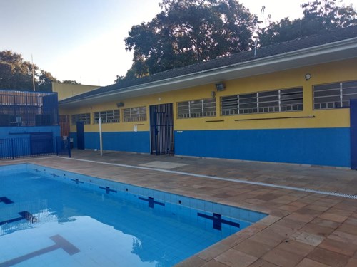 Na piscina do Jardim Satélite, estão em andamento os trabalhos de pintura geral, troca de portas e batentes da administração, pintura de gradil e substituição do forro.