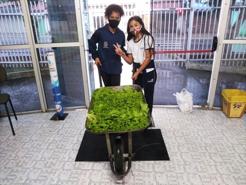 As crianças colocaram a mão na terra e participaram do plantio e colheita de verduras, frutas e legumes. O resultado foi carrinhos cheios de alface e muito suco para a garotada.