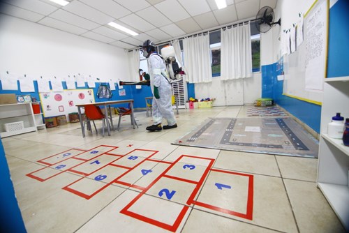 Assim que o dia termina nas escolas municipais de São José dos Campos, as equipes da Urbam (Urbanizadora Municipal) vestem seus macacões brancos, máscaras e luvas de segurança e iniciam o serviço de sanitização, que se estende até a madrugada. O trabalho é realizado todos os dias da semana, incluindo os fins de semana, das 17h às 5h, em 151 unidades.