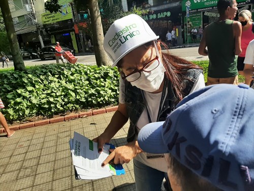 Os servidores entregaram aos munícipes folders com informações sobre como fazer o CadÚnico nos Cras (Centros de Referência de Assistência Social) e os benefícios de estar inscrito.