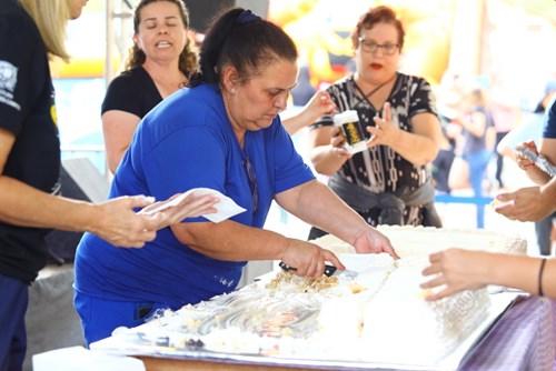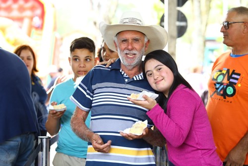 E para comemorar os 131 anos, teve parabéns e a tradicional distribuição do bolo de aniversário preparado por voluntários das famílias Dias e Rosa. Foram produzidas 40 formas de bolo que levaram mais de 25 quilos de doce de leite no recheio. Um bolo comunitário que contou com a doação de todos os mantimentos do preparo por moradores e comerciantes do distrito.