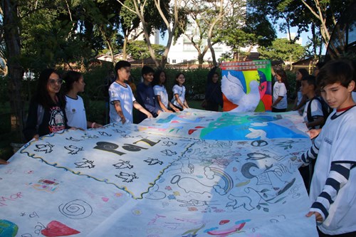 Manifesto. Alunos também fizeram bandeira com a pomba da paz. Foto: PMSJC