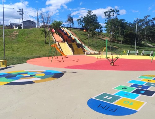 A intervenção contou com pintura artística no solo e revitalização do tobogã, trazendo mais cor, identidade e funcionalidade ao local. A pintura, com formas geométricas e cores vibrantes, vai além do aspecto visual: ela estimula o uso consciente do espaço e incentiva a convivência saudável entre crianças, jovens e famílias.