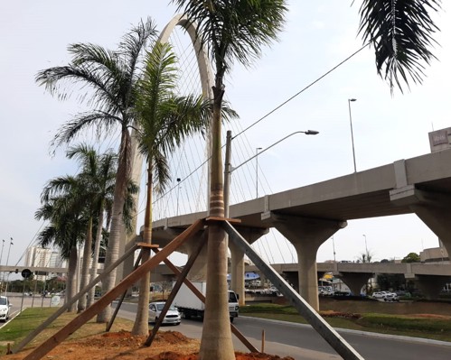 Após o plantio, foi instalado um tutoramento de madeira, apoio para manter as árvores seguras nas próximas semanas, durante a fase de adaptação das palmeiras.