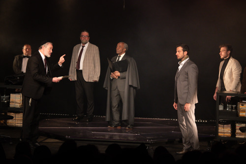O elenco de 12 atores conta a história de Antônio, mercador que contrai uma dívida com o agiota Shylock e aceita dar uma libra de sua própria carne como garantia. O não pagamento da dívida desencadeia um julgamento dramático, colocando em pauta temas como justiça e preconceito.